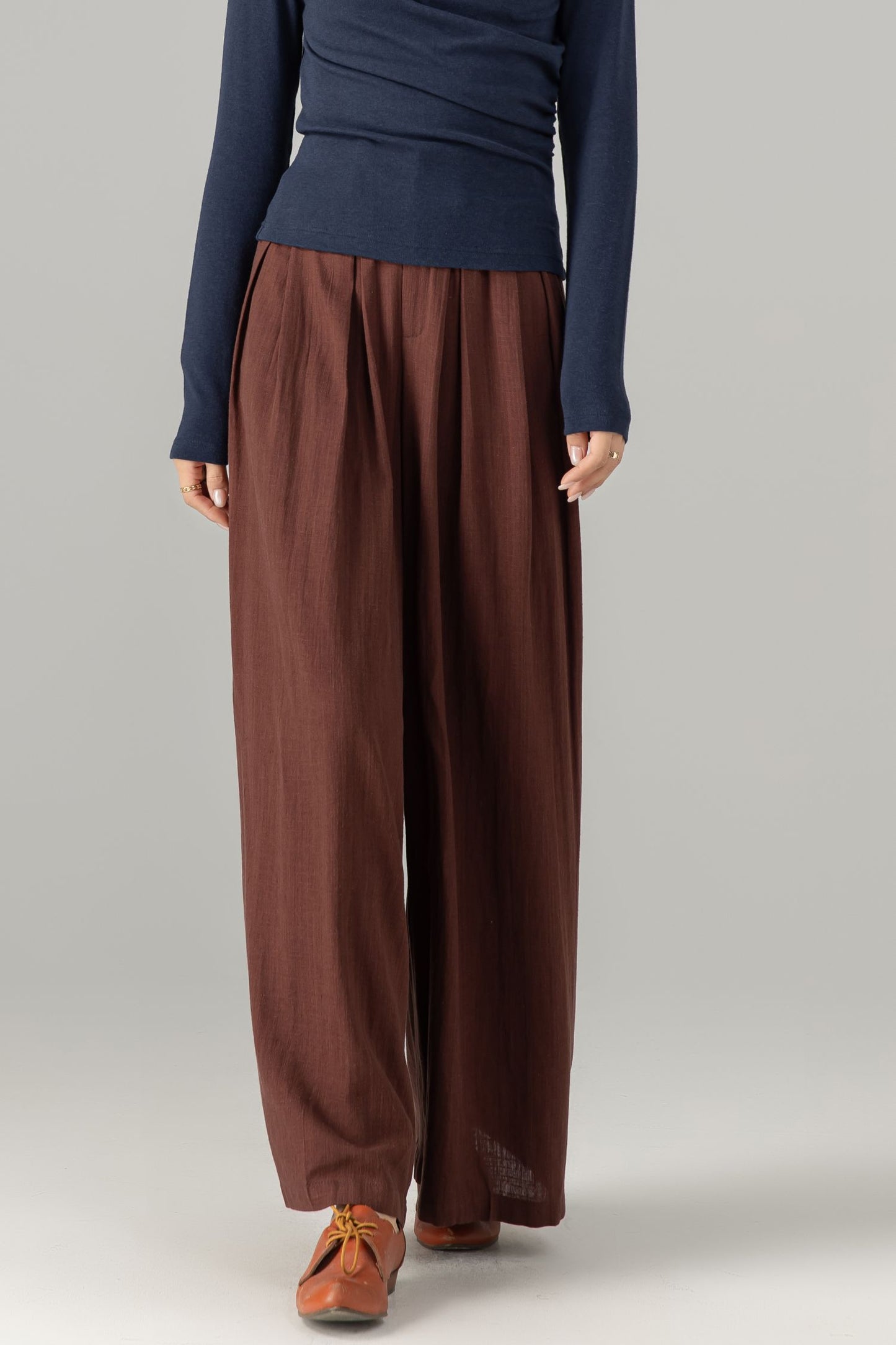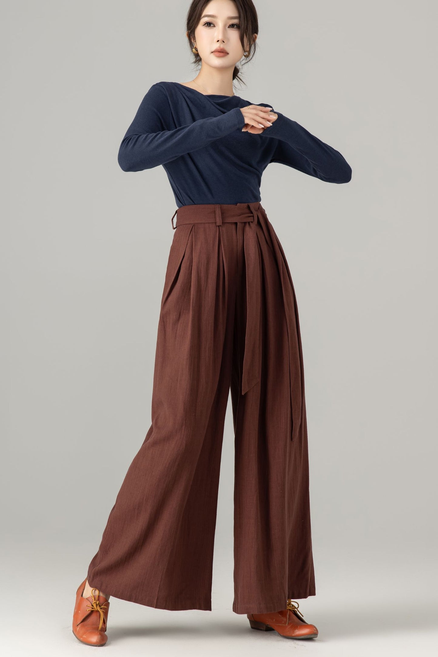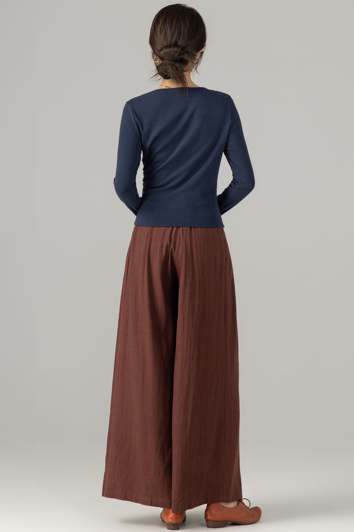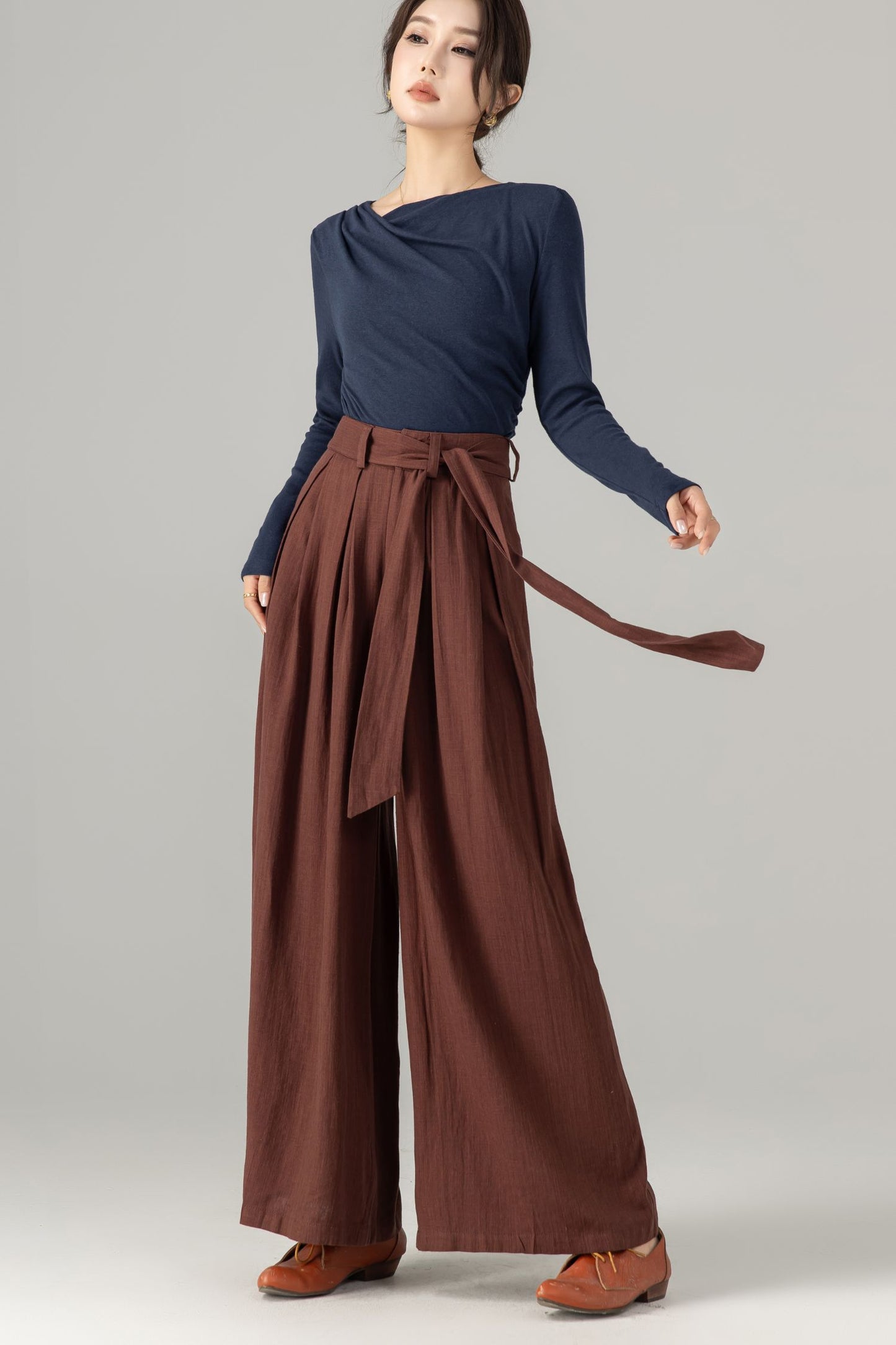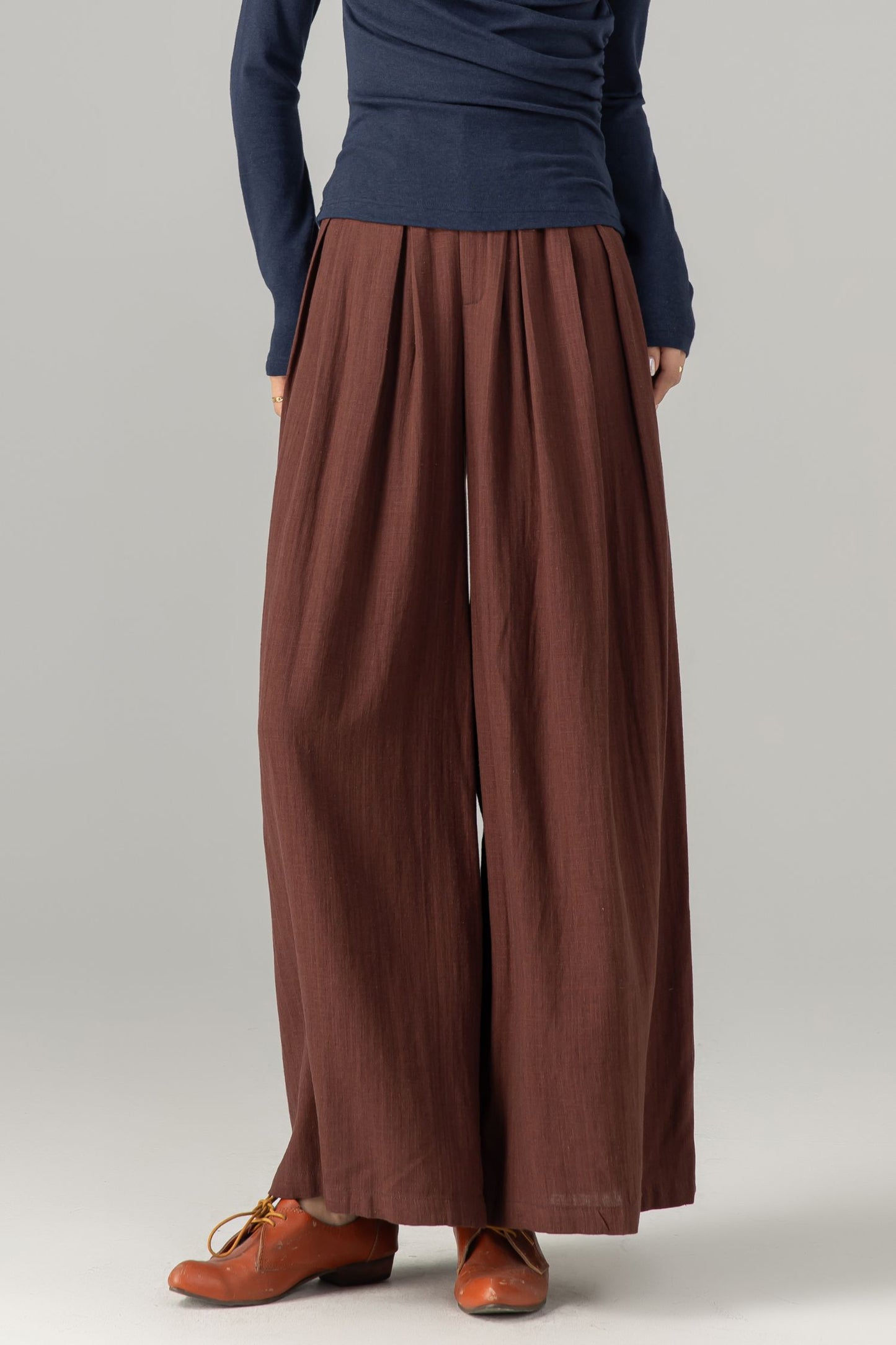 Our brown linen trousers are made from a soft fabric and have a fabric drawstring at the waist, making them stylish for summer and autumn. The style of the linen trousers gives them a skirt-like feel and the loose fit is comfortable to wear.