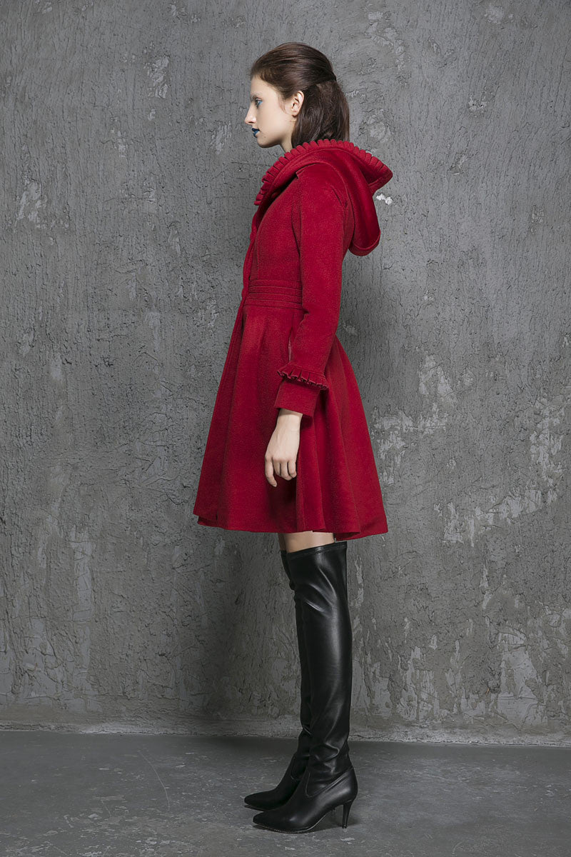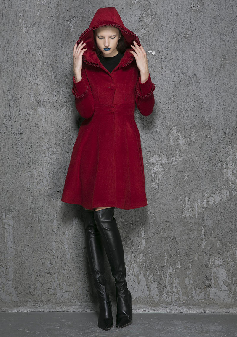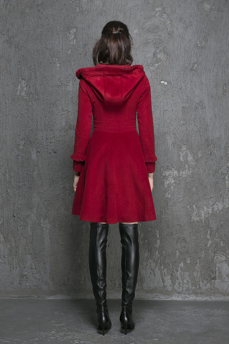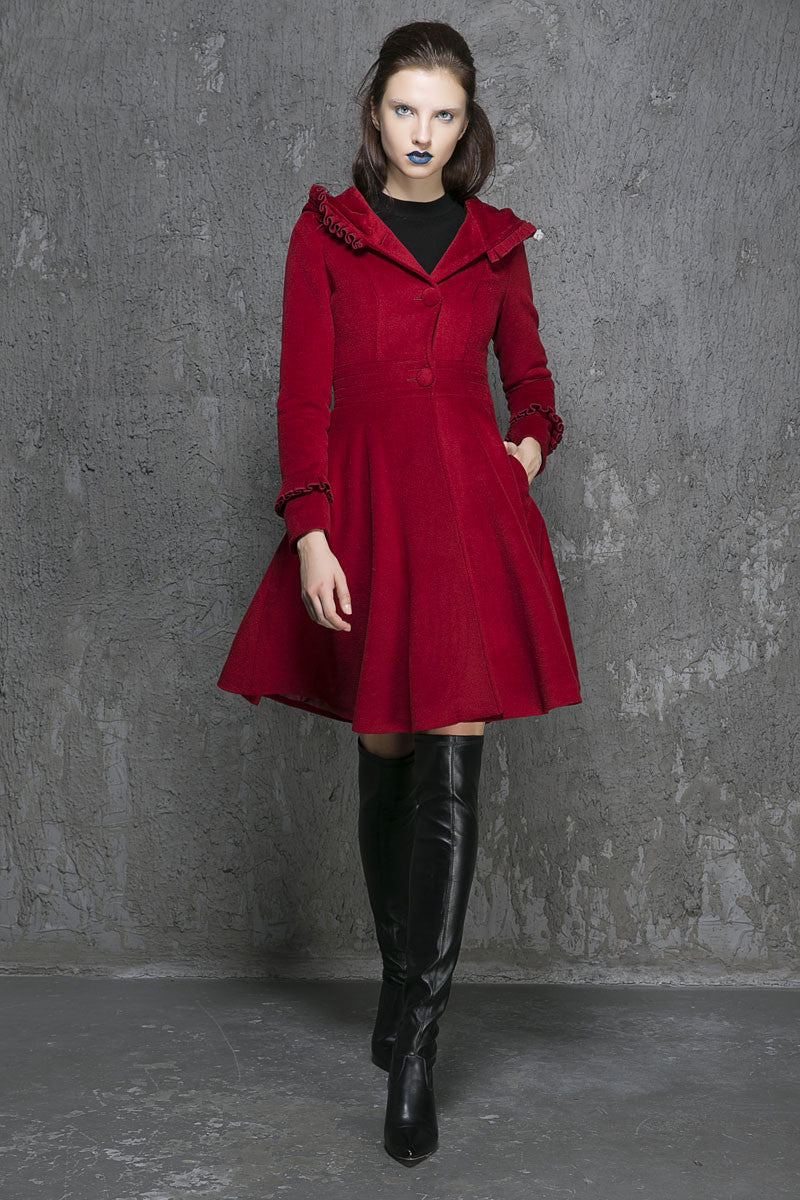 Embrace the charm of winter with this beautifully crafted wine red wool coat, designed to bring warmth, elegance, and confidence to every cold-weather outing. The soft wool blend wraps you in cozy comfort, while the feminine fit-and-flare silhouette flatters your shape effortlessly. A delicately ruffled hood and sleeve cuffs add a romantic touch, making the coat feel both timeless and unique—perfect for holiday strolls, everyday wear, or special seasonal moments. This is a winter wardrobe essential for women who want to stay warm without compromising on style.