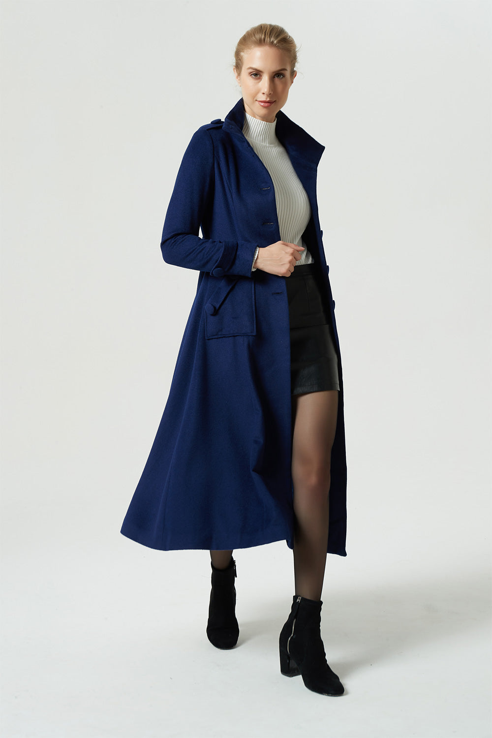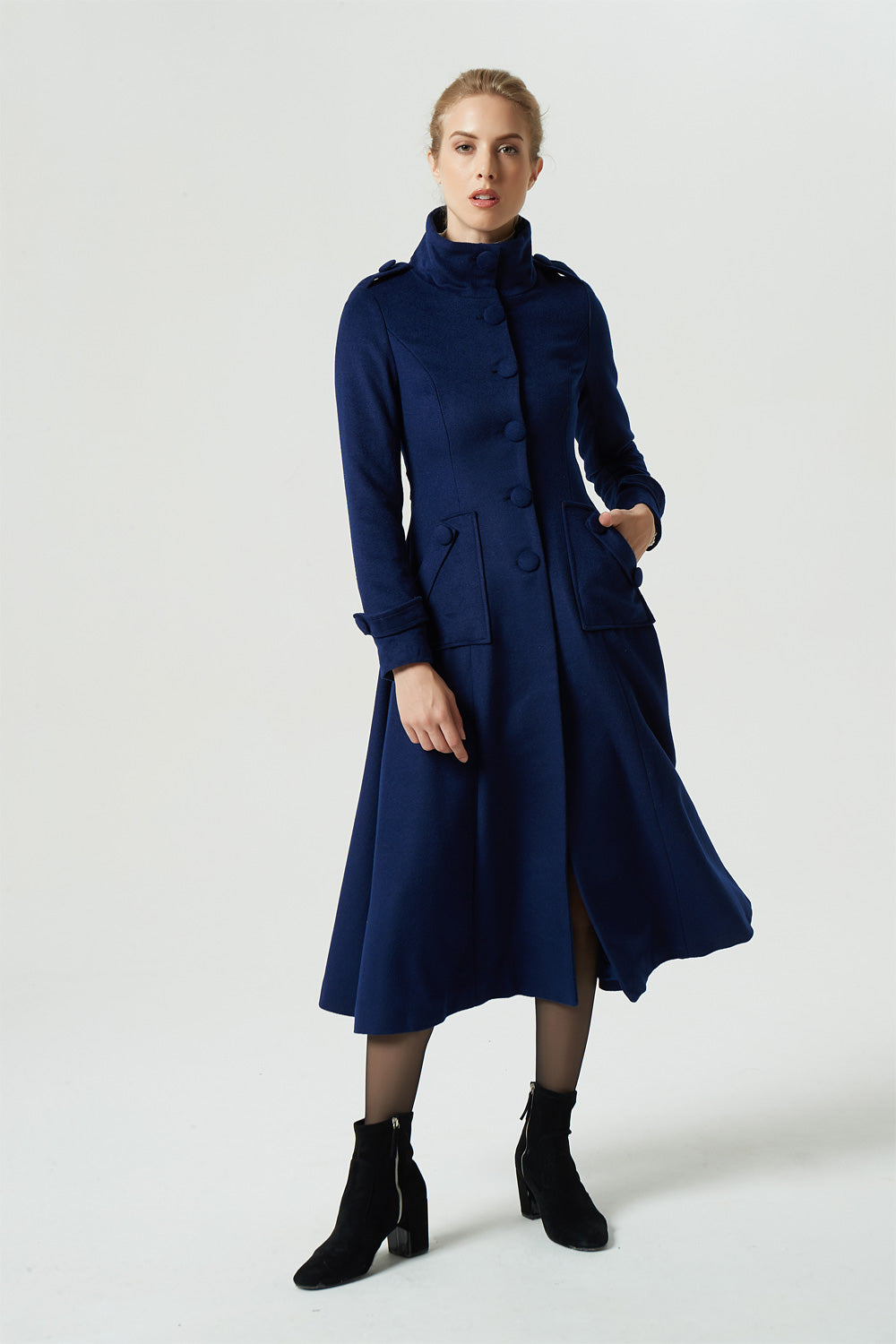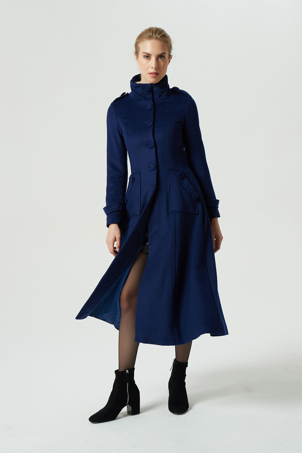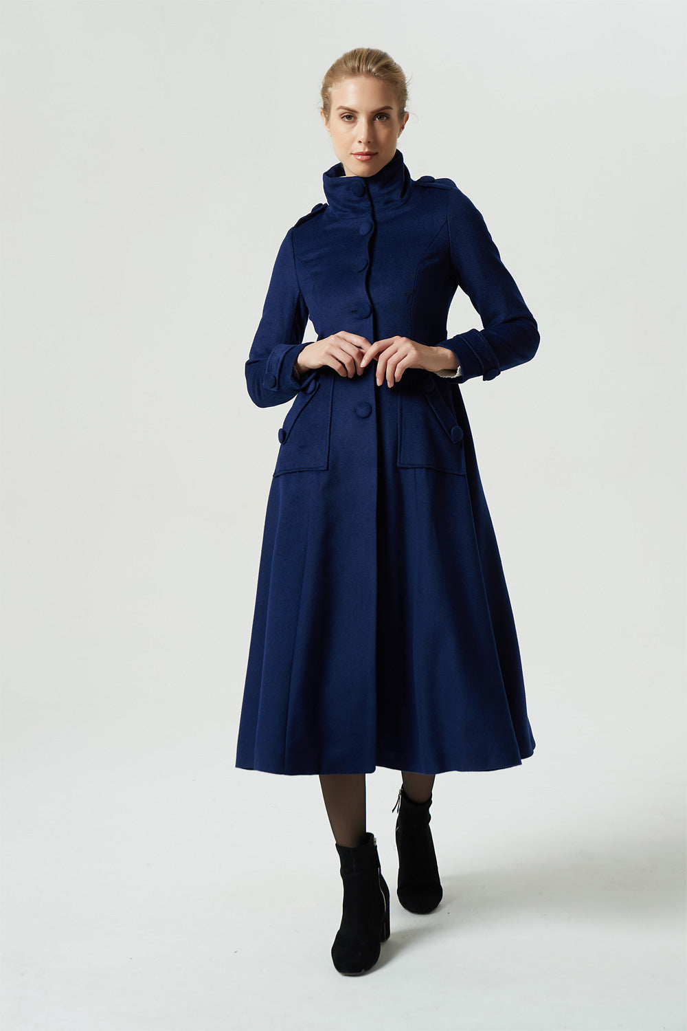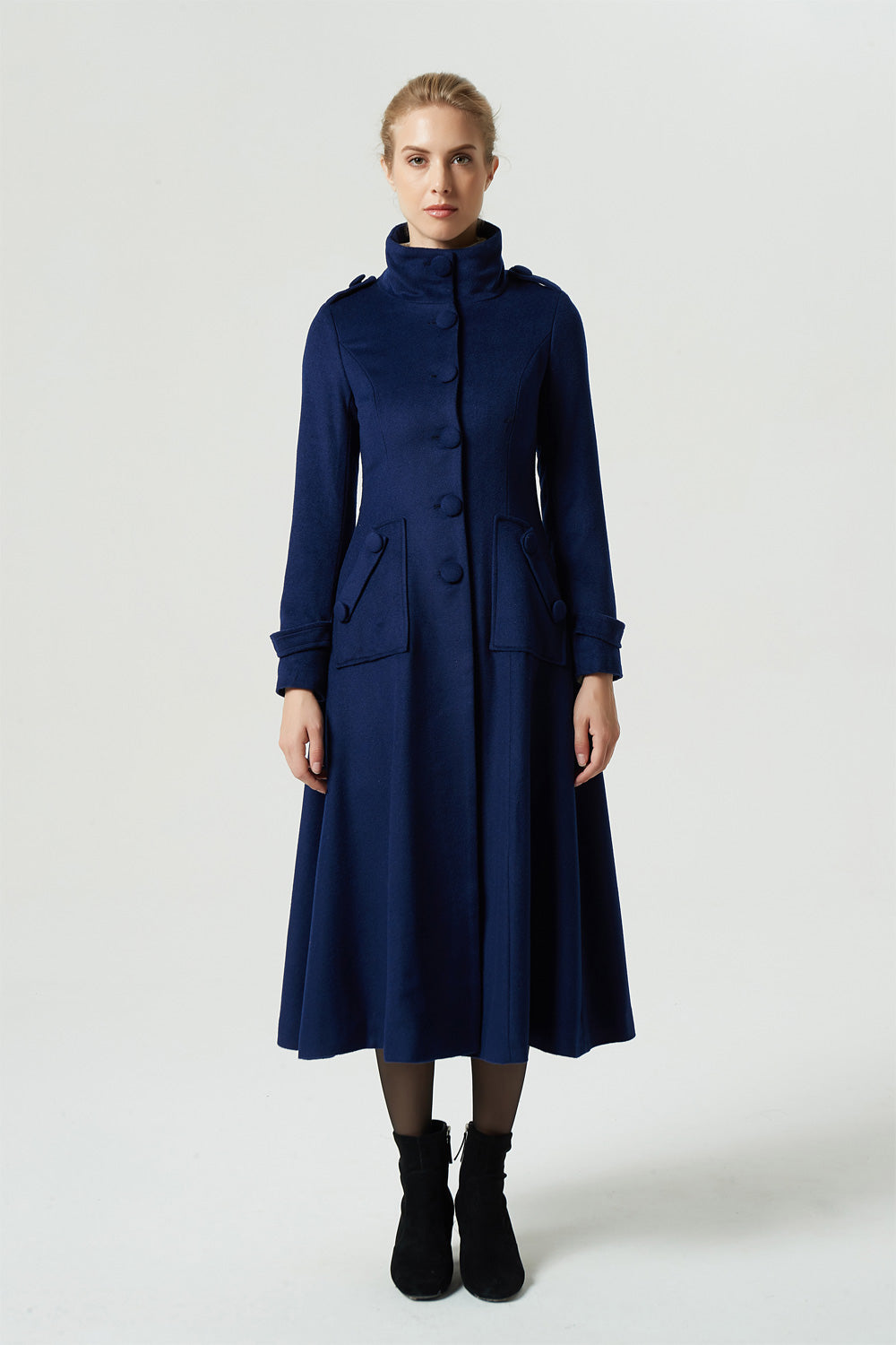 Inspired by classic military tailoring, this long navy wool coat brings timeless elegance to cold-weather dressing. Crafted from a warm wool blend, it features a structured stand collar, sculpted seams, and a flowing A-line silhouette that flatters effortlessly. The button-tab cuffs and large pockets add practical charm, while the full-length design keeps you beautifully warm through winter days and city evenings. Thoughtfully made for women who love refined, feminine outerwear with strength and character.