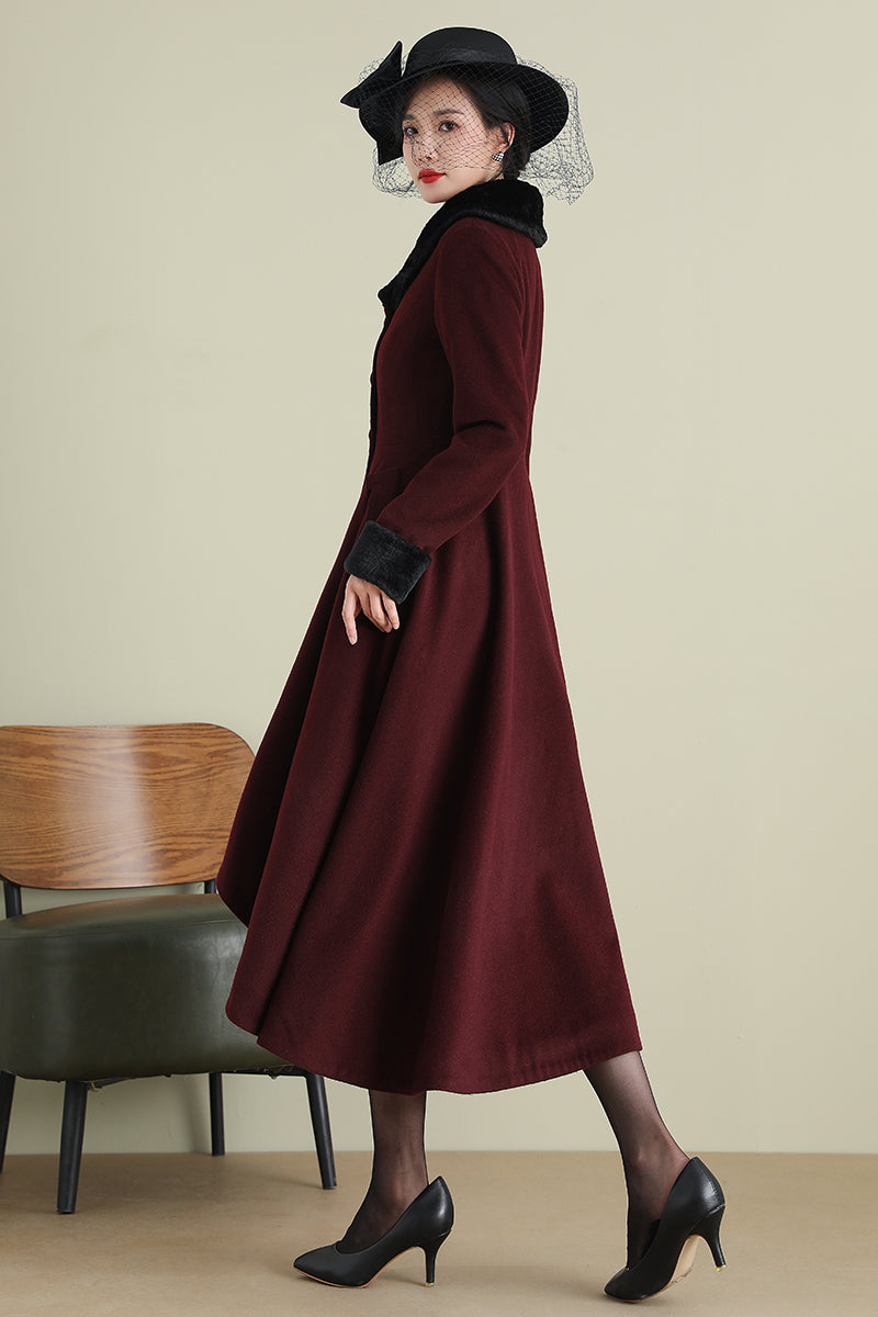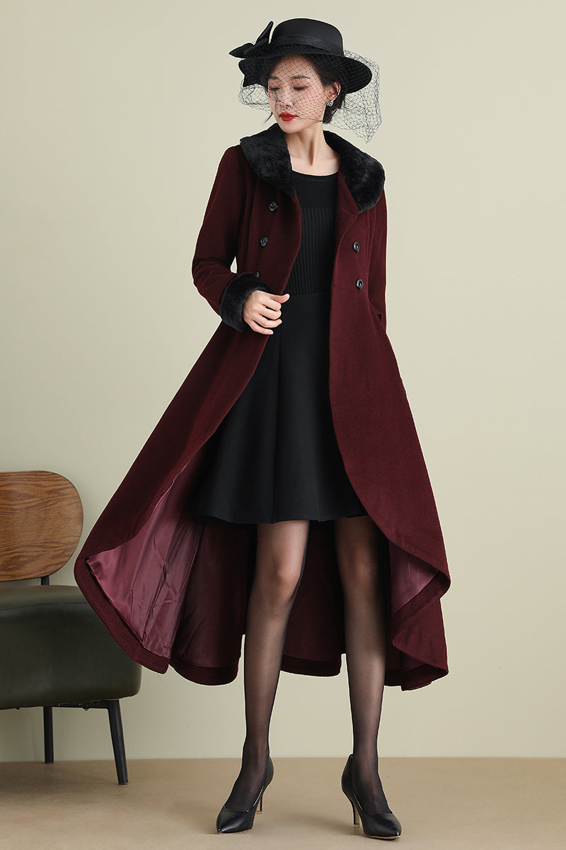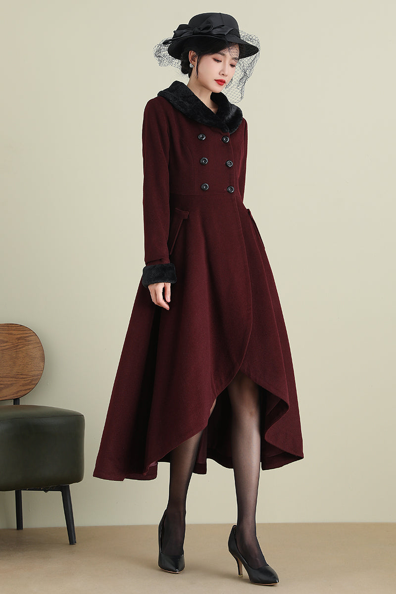 his vintage-inspired burgundy wool coat features a dramatic A-line silhouette with a high-low hem. The double-breasted design and faux fur collar create an elegant winter statement. Crafted from a warm medium-weight wool blend, it’s ideal for autumn-to-winter styling.