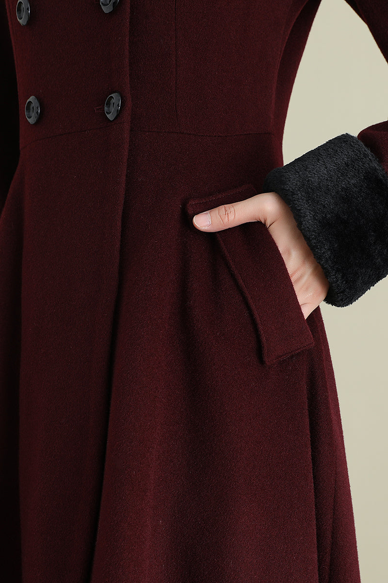 Xiaolizi Vintage Burgundy Wool Coat for Women – Handmade A-line High-Low Winter Coat with Faux Fur Collar 3895