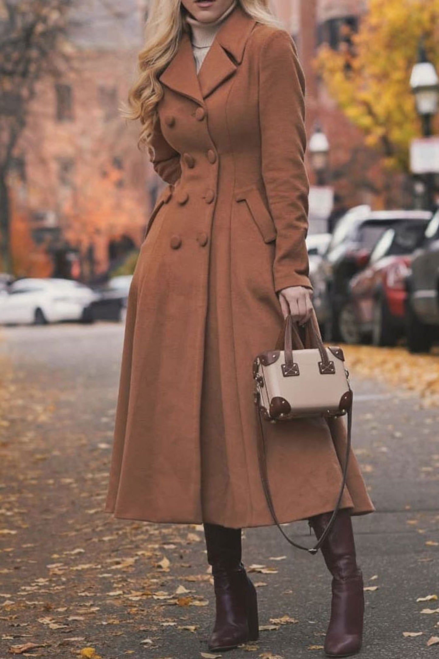 Step into timeless elegance with this camel wool maxi coat. Crafted from a premium wool blend with a smooth satin lining, it features a tailored double-breasted front, wide A-line swing silhouette, and calf-length hem for graceful movement. Perfect for autumn-to-winter transitions, this coat blends vintage sophistication with everyday functionality—ideal for city strolls, festive gatherings, or formal outings.