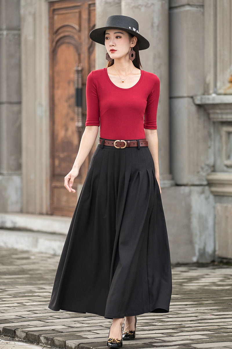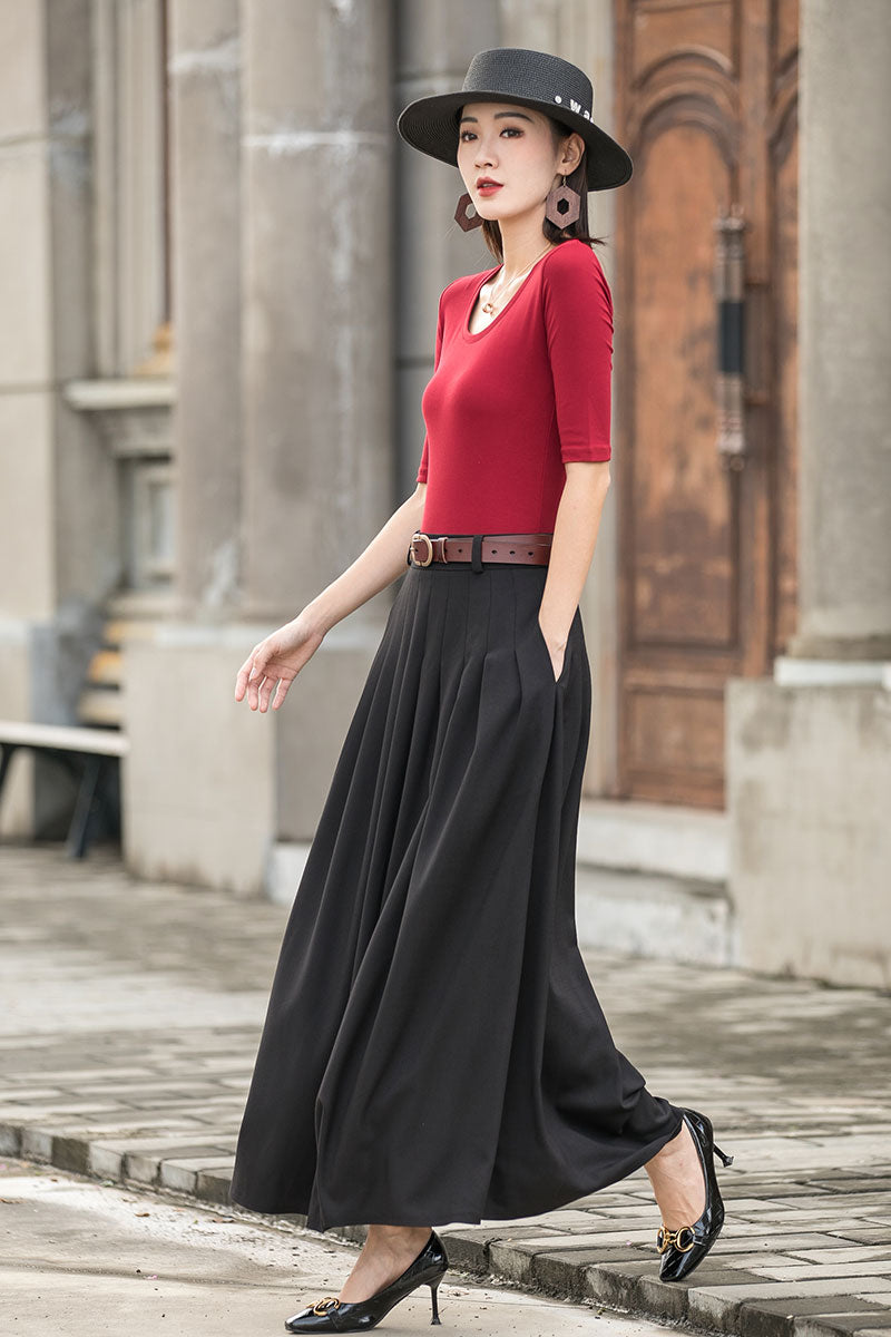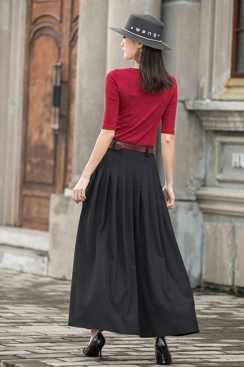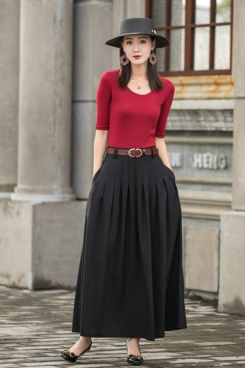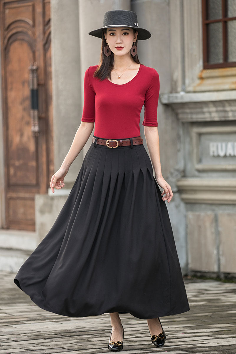 Women Black Pleated Linen Maxi Skirt with Pockets 2777