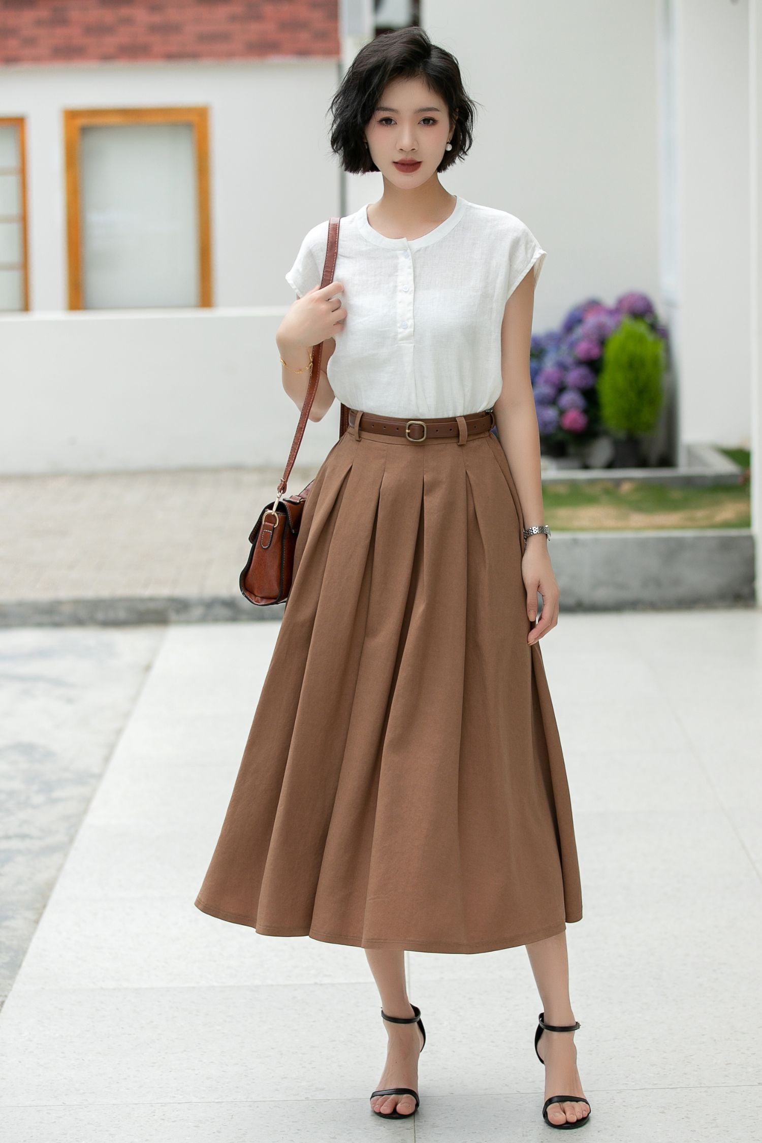 This brown high-waisted linen skirt is a timeless piece that blends natural elegance with everyday comfort. Made from a breathable linen blend, it features structured pleats, a flattering A-line silhouette, and convenient side pockets. The tailored waistband with belt loops adds a classic, vintage-inspired touch – perfect for pairing with tucked-in blouses or cropped tops.