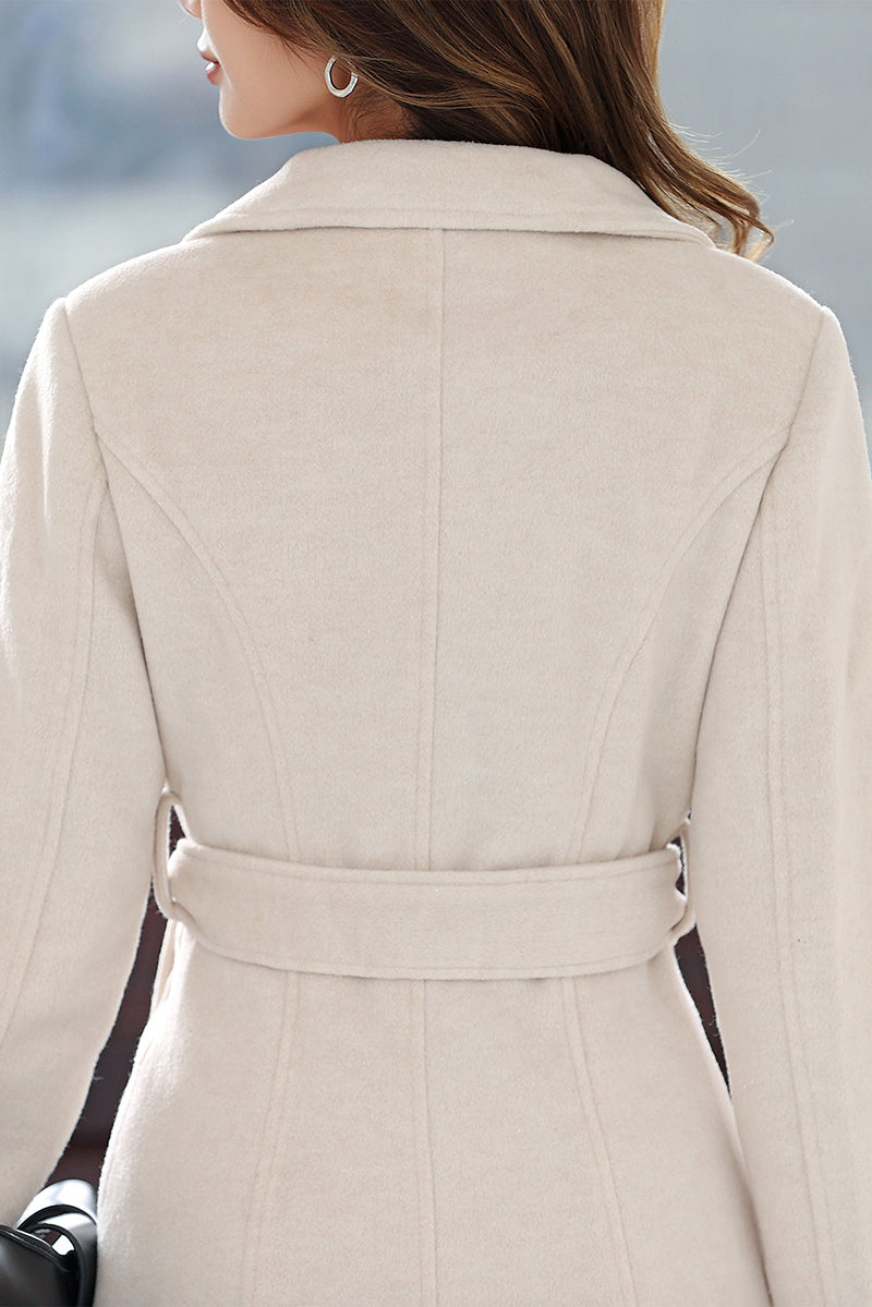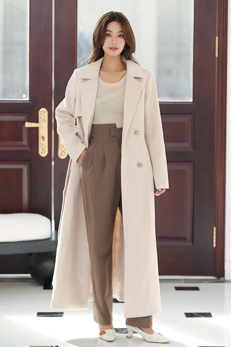 Handmade Cream Wool Coat – Elegant Double-Breasted Long Belted Overcoat | Xiaolizi 4019