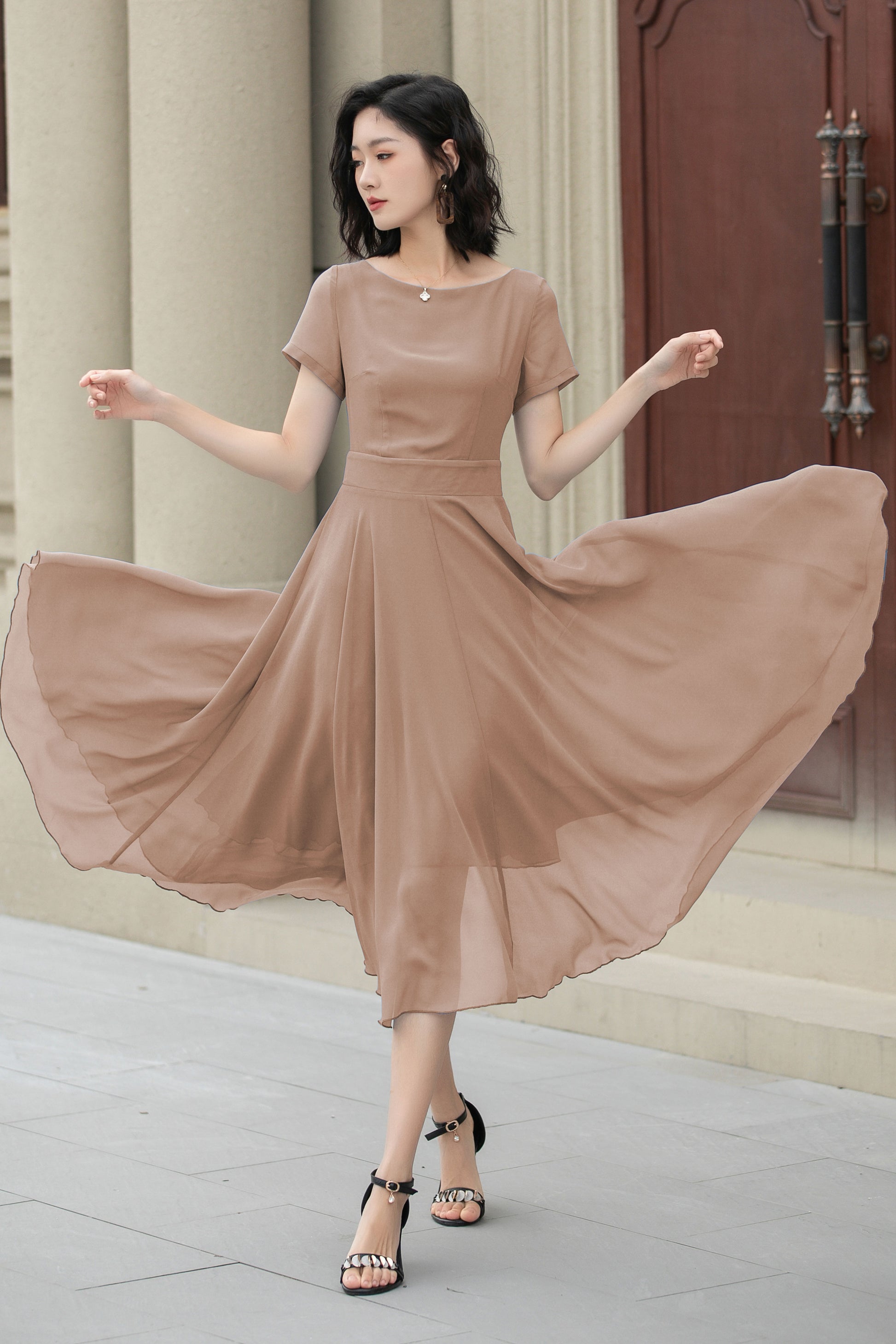 This chiffon dress is an exquisite option for wedding - related events. With its elegant round neck and short sleeves, it exudes understated charm. The waist - cinching design flatters the figure, while the voluminous, flowing skirt adds a touch of romance. In a versatile beige hue, it's perfect for wedding guests or as a bridesmaid dress, ensuring you look effortlessly stylish.
