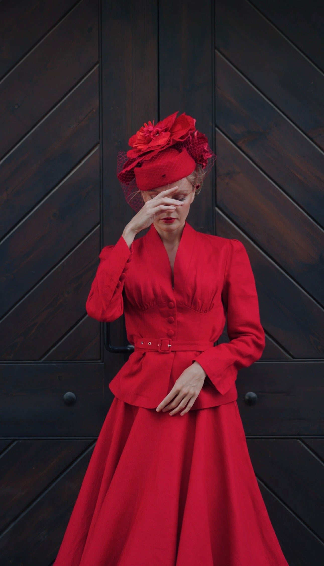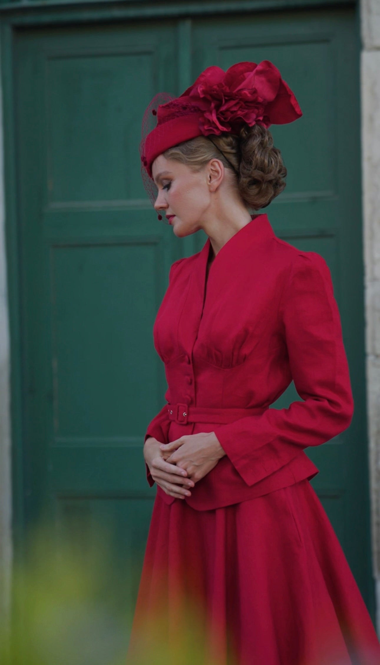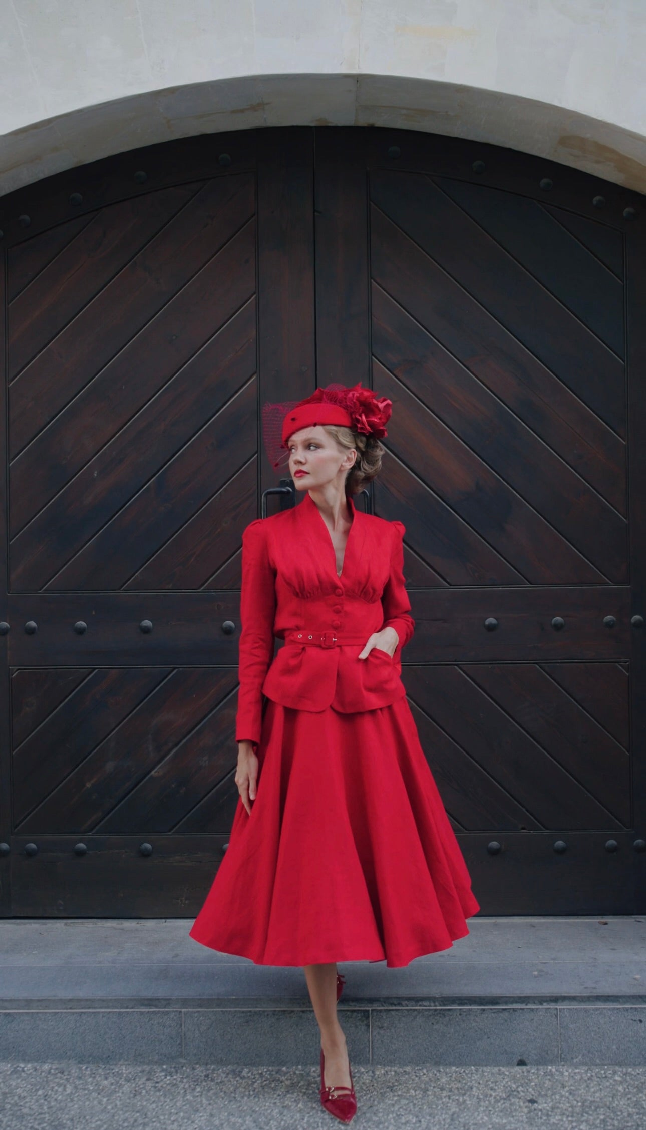 Thanks for @tanysunnyart wear Xiaolizi's suit. Turn heads with this red linen two-piece set, designed for effortless elegance andtimeless charm. The tailored V-neck blazer top creates a flattering silhouette, whilethe flowing A-line midi skirt falls gracefully to mid-calf, offering both comfort andsophistication.