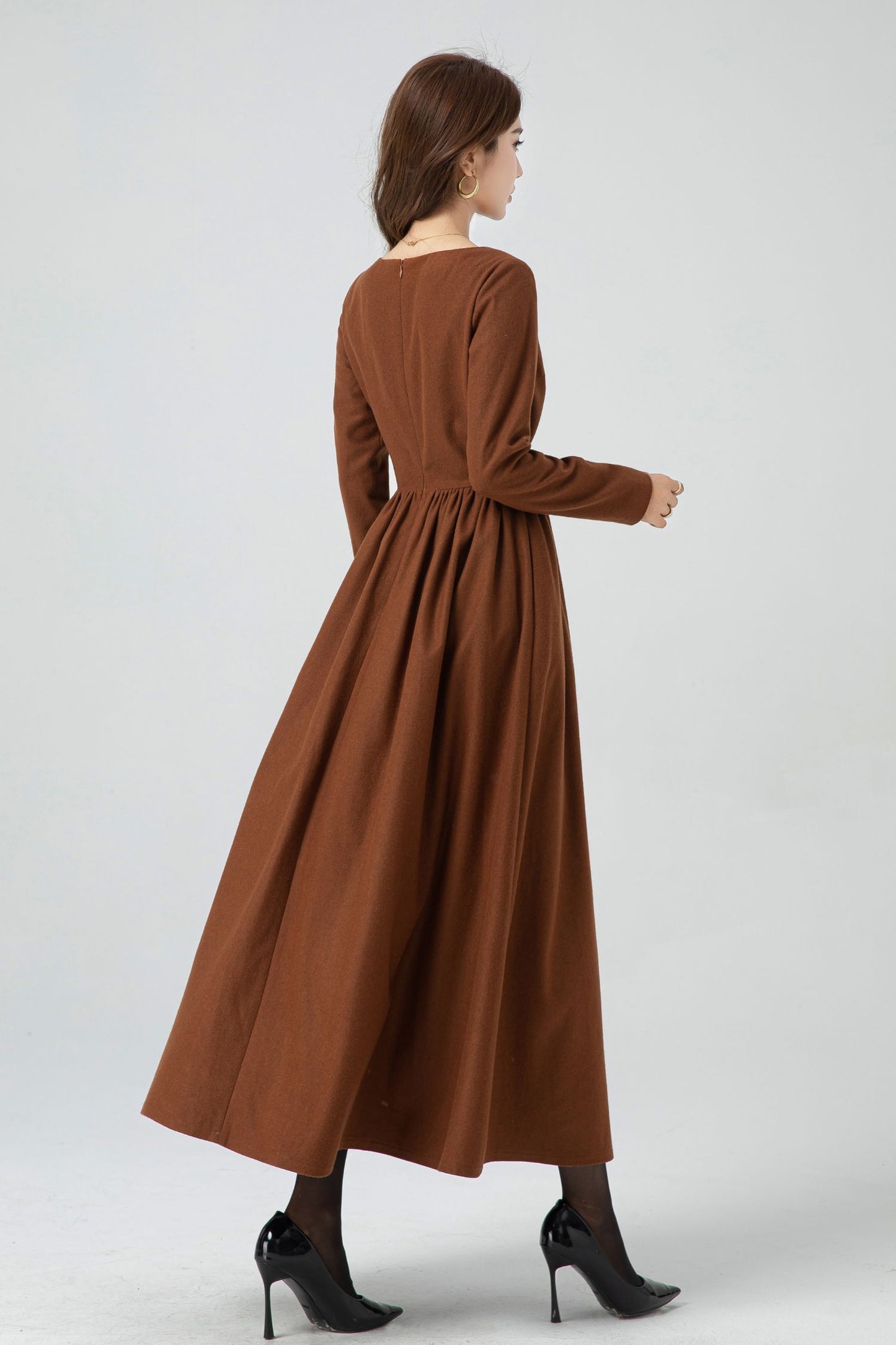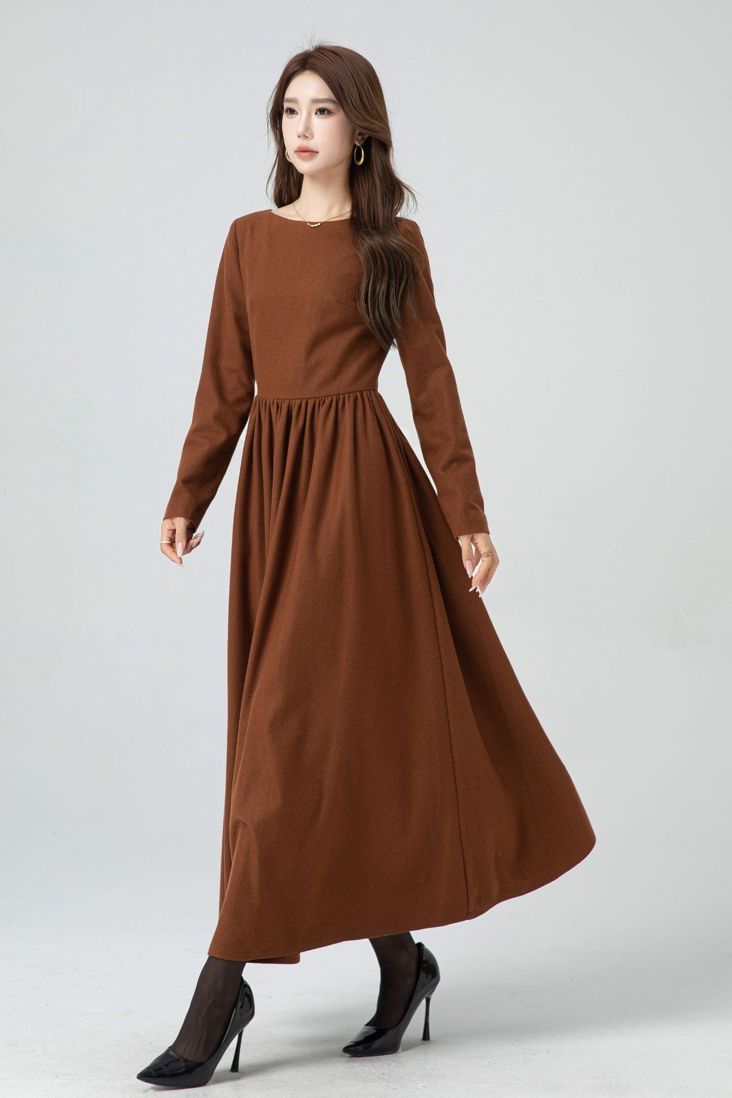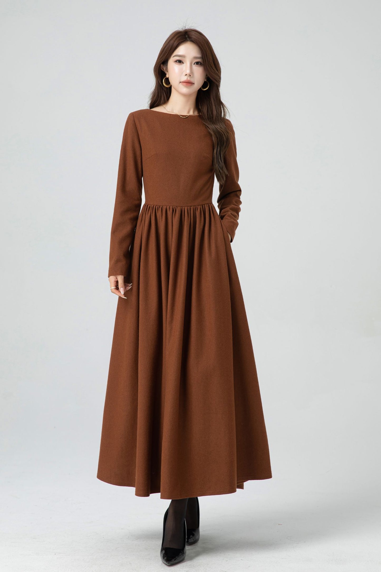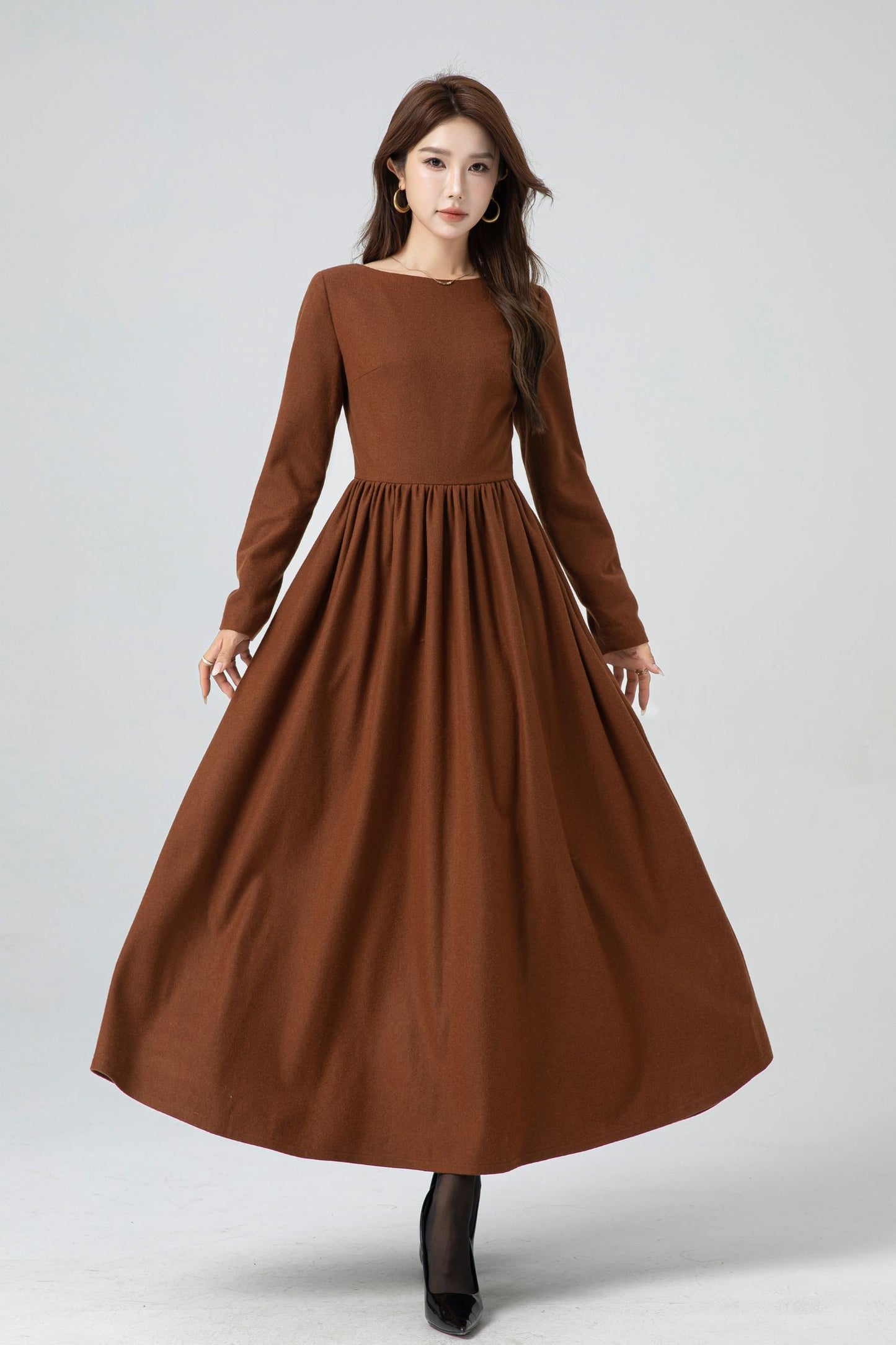 Embrace timeless beauty with this handmade wool-blend maxi dress. Designed with a classic fit-and-flare silhouette, it features a flattering pleated waistline and a graceful full-length hem. The rich brown hue adds warmth and sophistication, while the fully lined interior ensures comfort through the cooler months. Perfect for autumn and winter, this dress transitions effortlessly from everyday wear to elegant seasonal gatherings.