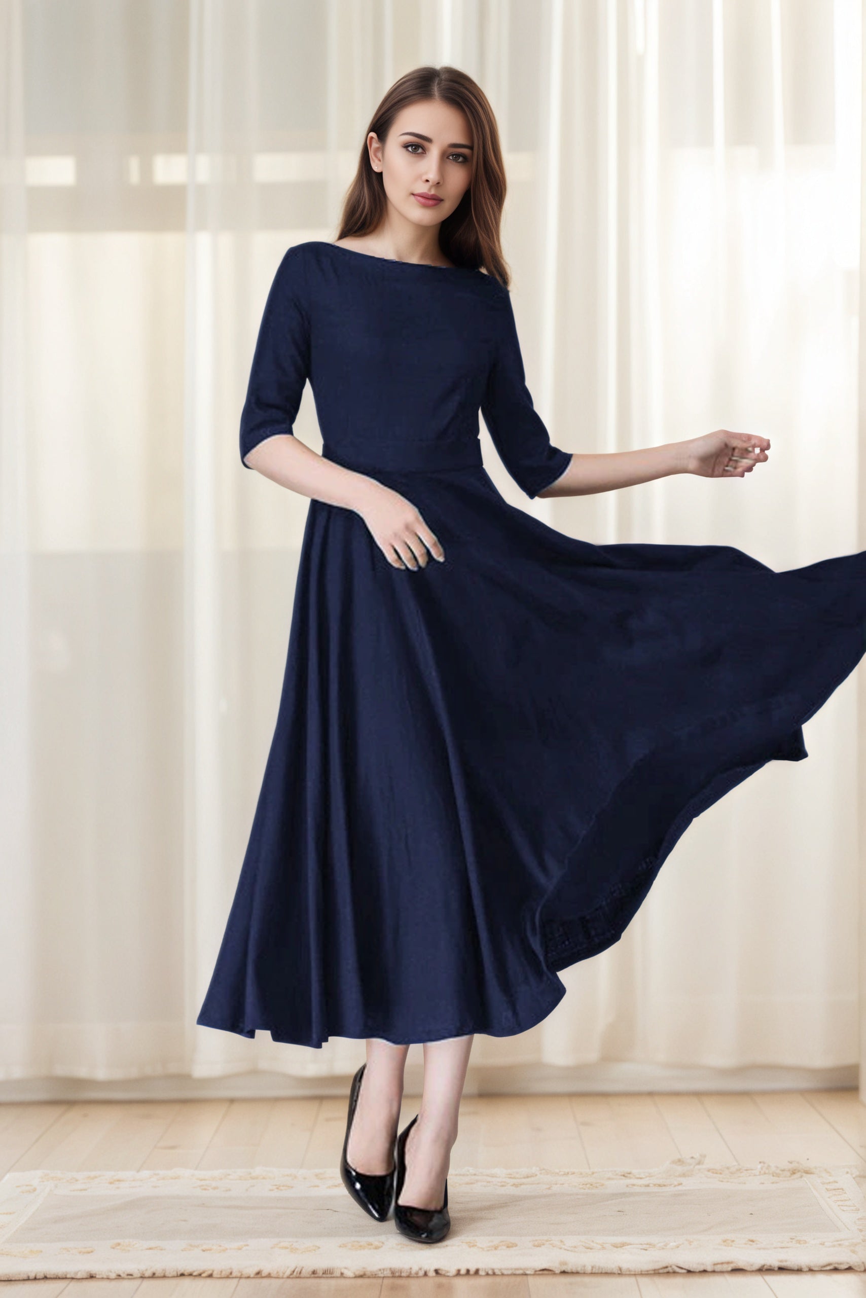 Xiaolizi Navy Linen Dress – Vintage Fit and Flare Midi Dress with Pockets 6654