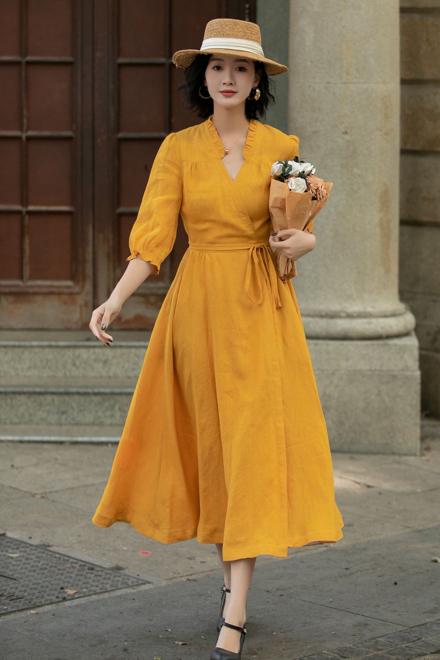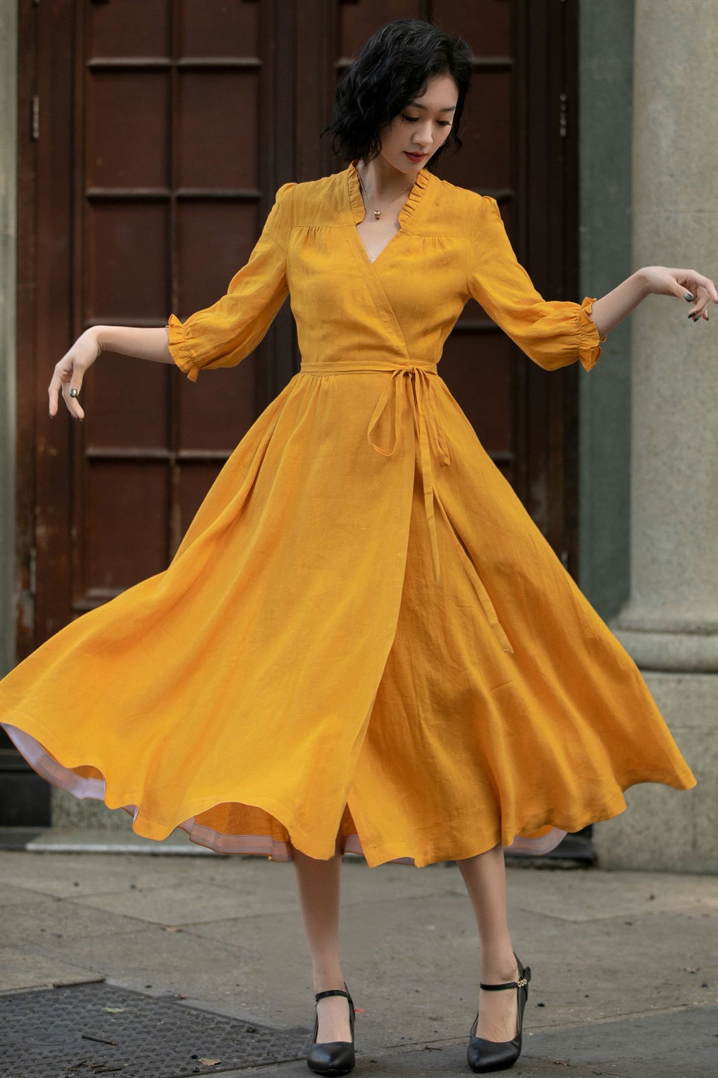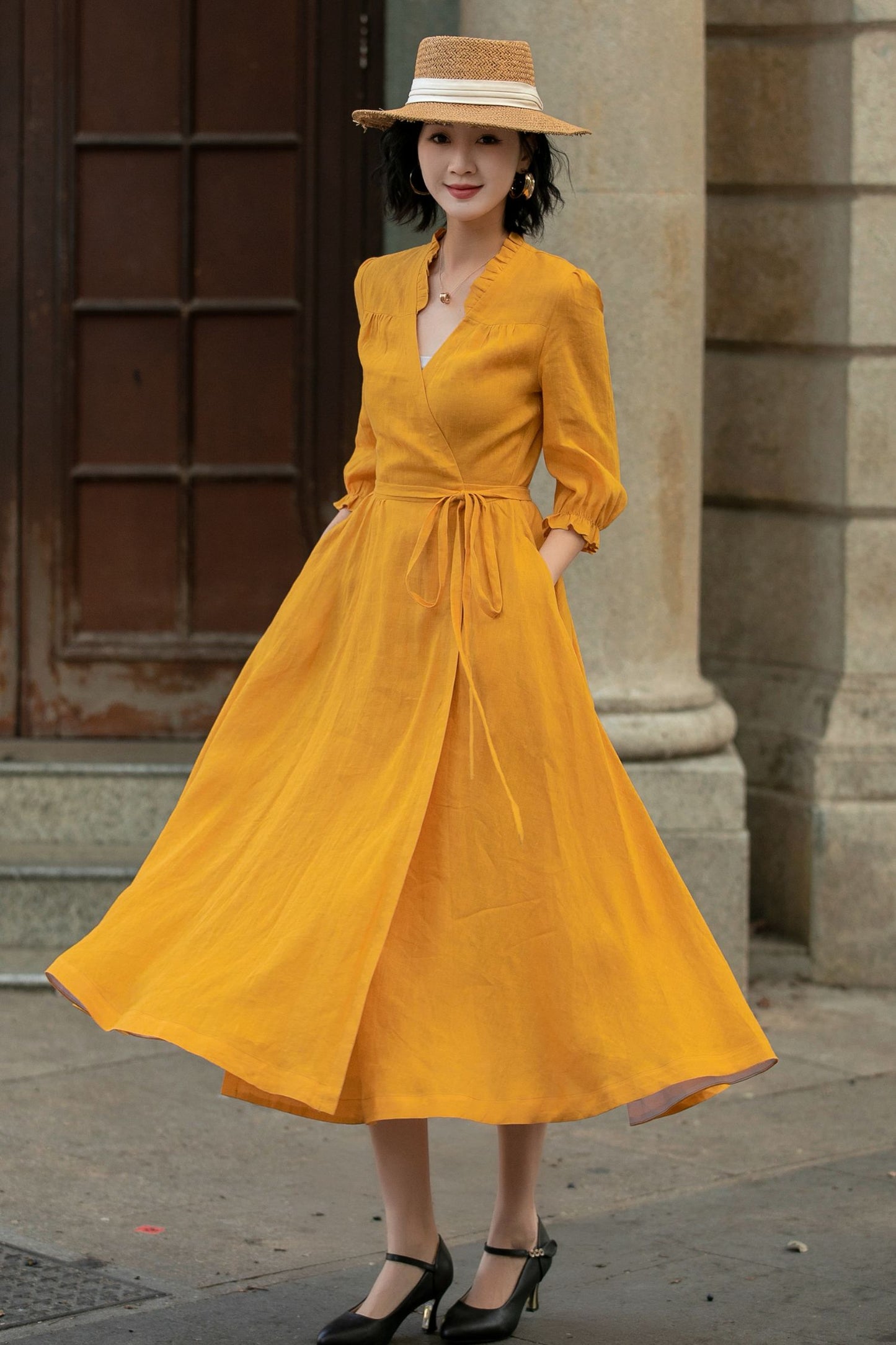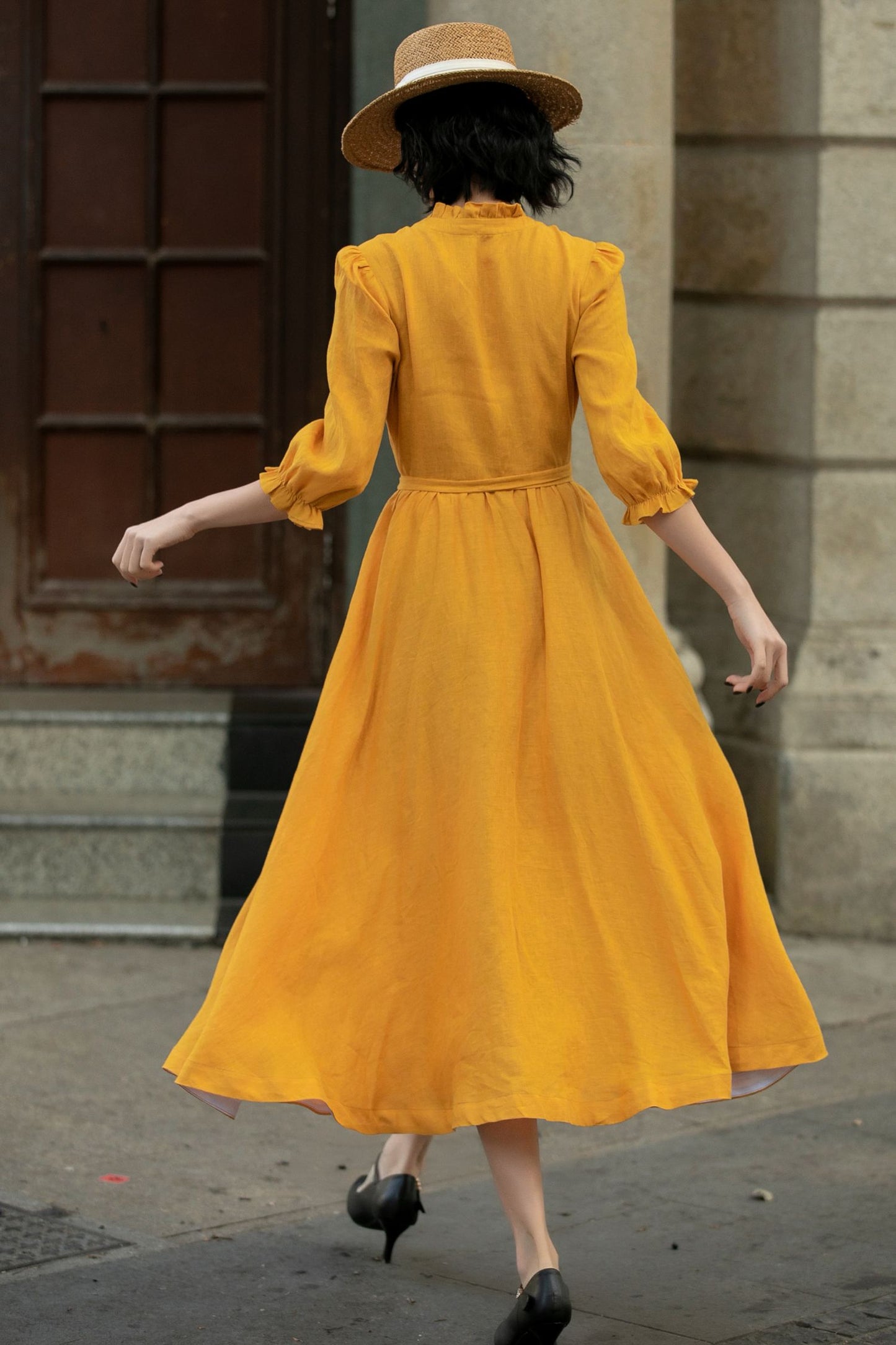 This is an unique dress that has a very unique design with lots of detail in the collar, sleeves and waist. It's such a great color for spring and summer! It's hard not to draw attention to yourself when you're the center of attention in it, made of pure linen that looks good and is comfortable at the same time.